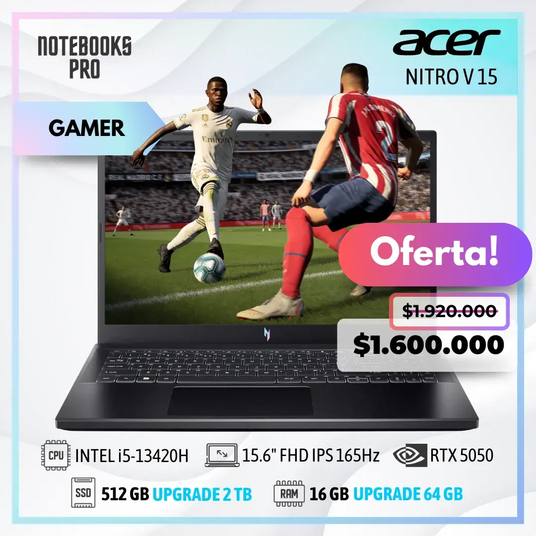 ACER NITRO V 15 – i5-13420H – SSD 512 GB – 16 GB RAM – 15.6″ FHD IPS 165Hz – RTX 5050 – Teclado Retroiluminado – 8 Núcleos