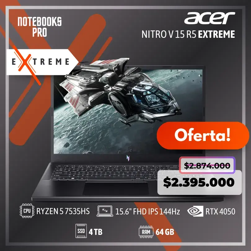ACER NITRO V 15 R5 – RYZEN 5 7535HS – SSD 512 GB – 16 GB RAM DDR5 – RTX 4050 – 15.6″ FHD IPS 144Hz