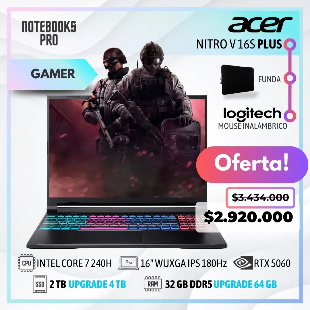 ACER NITRO V 16S PLUS – INTEL CORE 7 240H – SSD 2 TB – 32 GB RAM DDR5 – RTX 5060 – 16″ WUXGA IPS 180Hz – 10 Núcleos – Teclado Retroiluminado