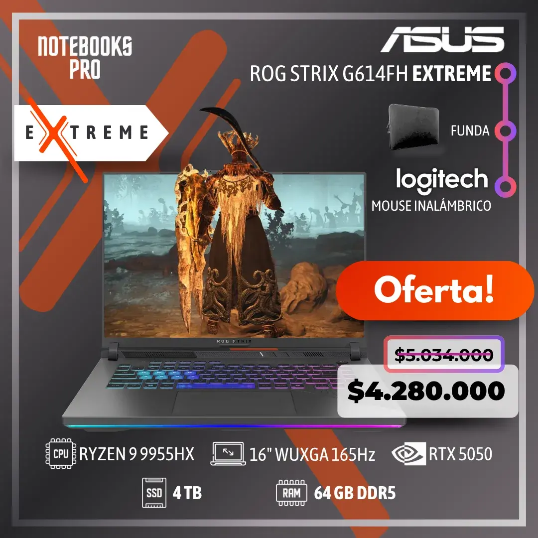 ASUS ROG STRIX G614FH EXTREME – RYZEN 9 9955HX – SSD 4TB – 64 GB RAM DDR5 – 16″ WUXGA 165Hz – RTX 5050 – Teclado retroiluminado – 16 Núcleos