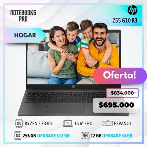 HP 255 G10 R3 – RYZEN 3 7330U PLUS – SSD 512 GB – 16 GB RAM – 15.6″ HD – Teclado Español – 4 núcleos