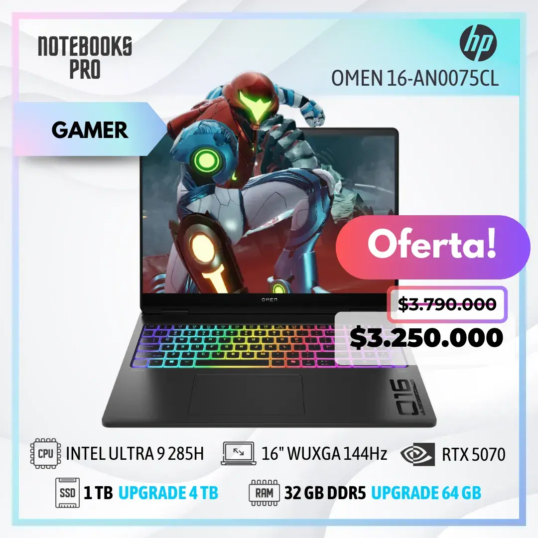 HP OMEN 16-AN0075CL – ULTRA 9 285H – SSD 1 TB – 32 GB RAM DDR5 – RTX 5070- 16″ WUXGA 144Hz – Teclado Retroiluminado – 16 Núcleos