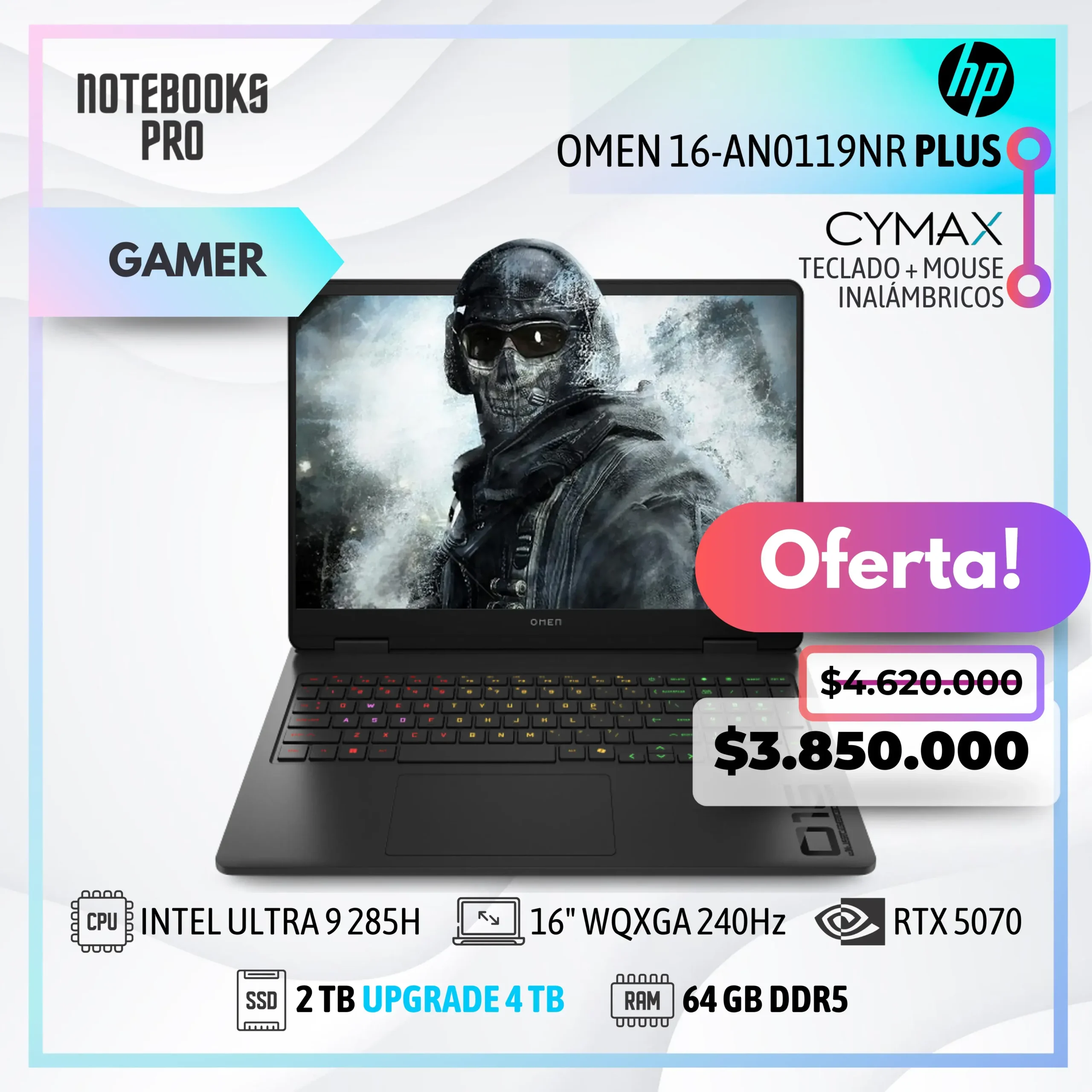 HP OMEN 16-AN0119NR PLUS – ULTRA 9 285H – SSD 2 TB – 64 GB RAM DDR5 – RTX 5070 – 16″ WQXGA 240Hz – Teclado Retroiluminado – 16 Núcleos + KIT TECLADO + MOUSE WIRELESS CYMAX