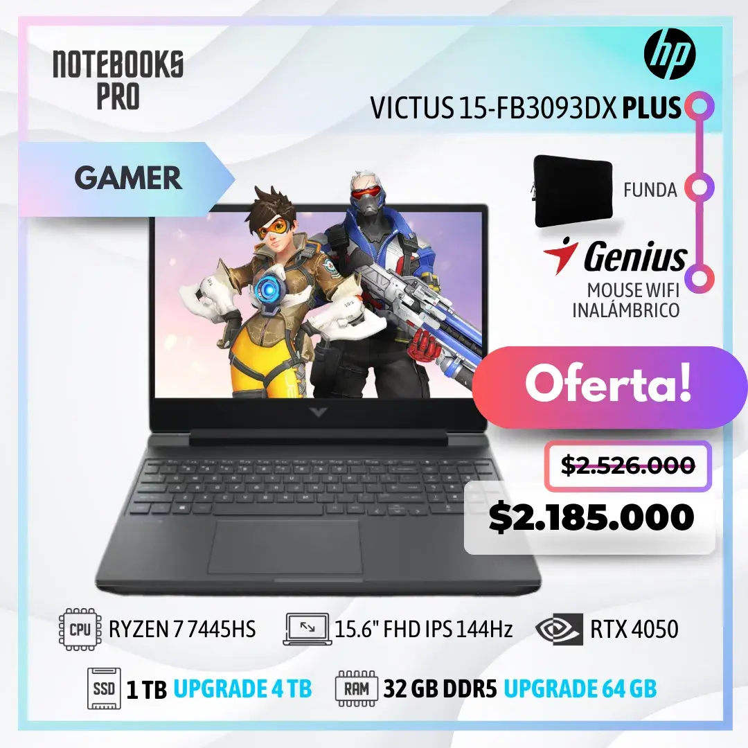 HP VICTUS 15-FB3093DX PLUS – RYZEN 7 7445HS – SSD 1 TB – 32 GB RAM DDR5 – 15.6″ FHD IPS 144Hz – RTX 4050 – 6 núcleos – Teclado retroiluminado