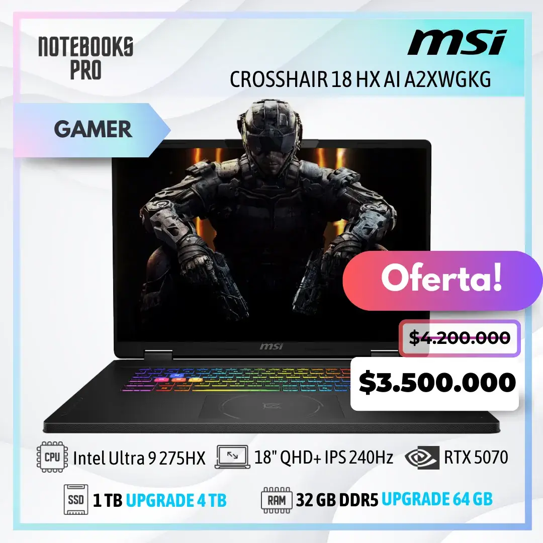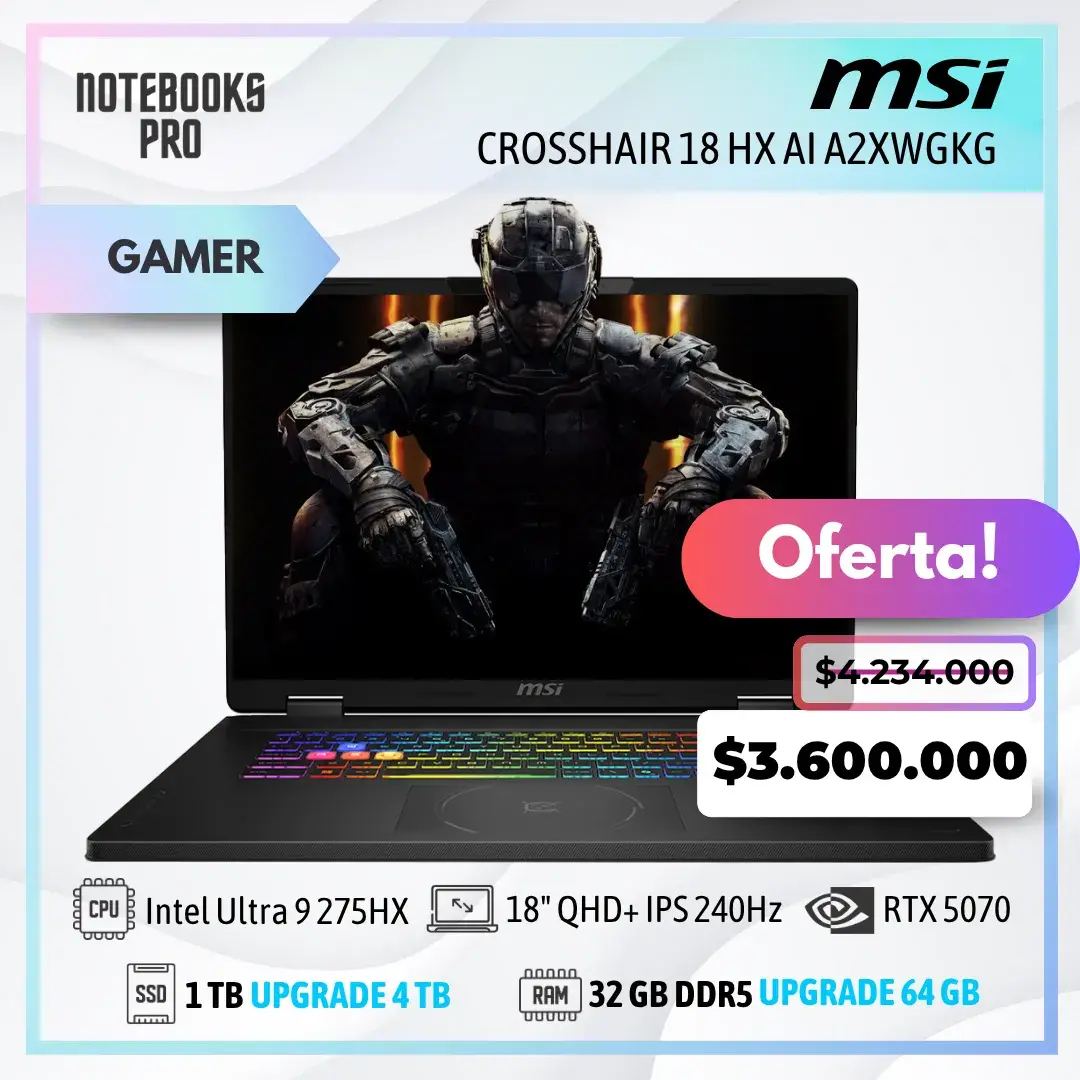 MSI CROSSHAIR 18 HX AI A2XWGKG – Ultra 9 275HX – SSD 1 TB – 32 GB RAM DDR5 – RTX 5070 – 18″ QHD+ IPS 240Hz – Teclado Retroiluminado – 24 Núcleos