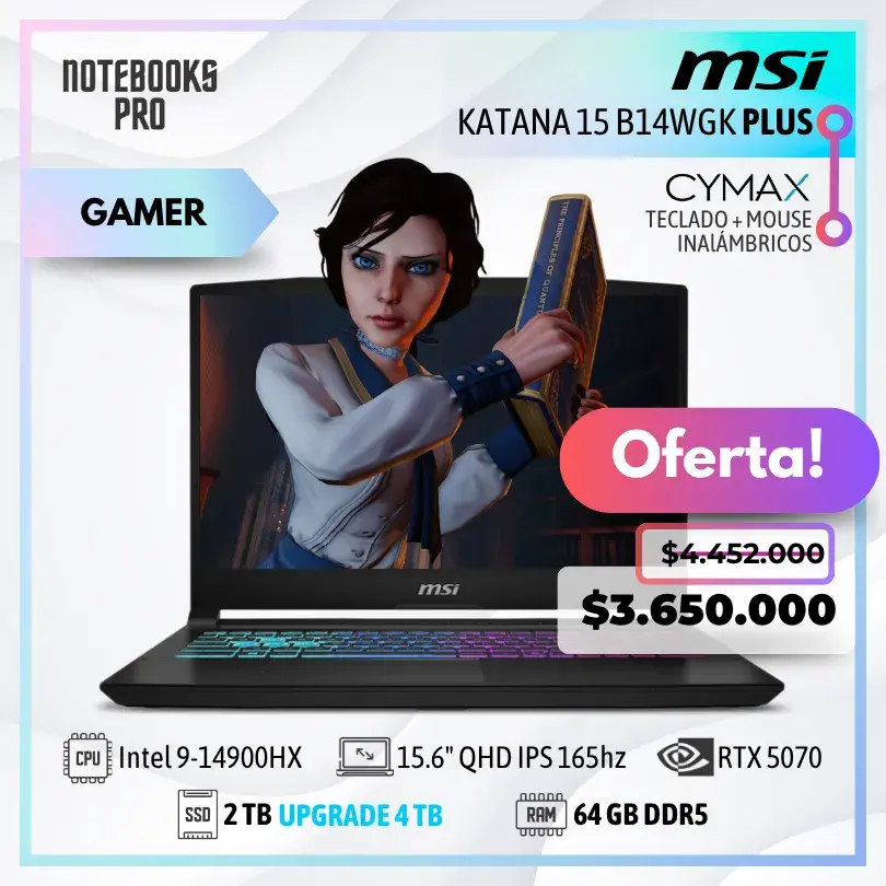 MSI KATANA 15 B14WGK PLUS – i9-14900HX – SSD 2 TB – 64 GB RAM DDR5 – RTX 5070 – 15.6″ QHD IPS 165hz – 24 núcleos – Teclado retroiluminado + KIT TECLADO + MOUSE WIRELESS CYMAX